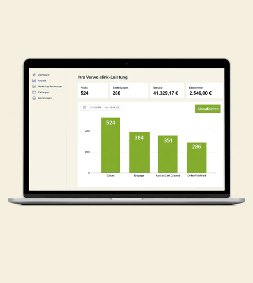 • 10% Provision auf den Netto-Warenkorbwert (vergütet wird das gesamte Produktsortiment, ausgenommen Gutscheine)